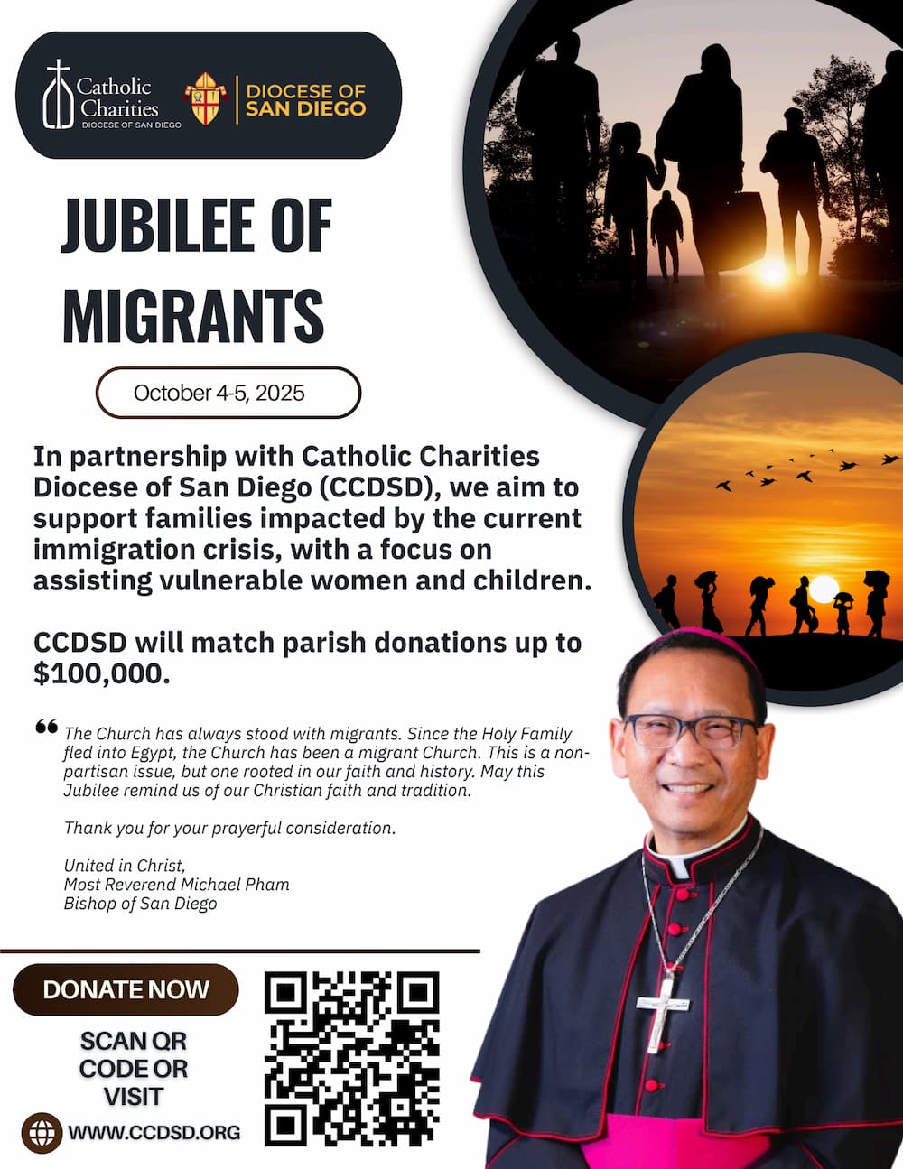 In partnership with Catholic Charities (CCSD), we aim to support families impacted by the current immigration crisis, with a focus on assisting vulnerable women and children. CCSD will match parish donations up to $100,000.