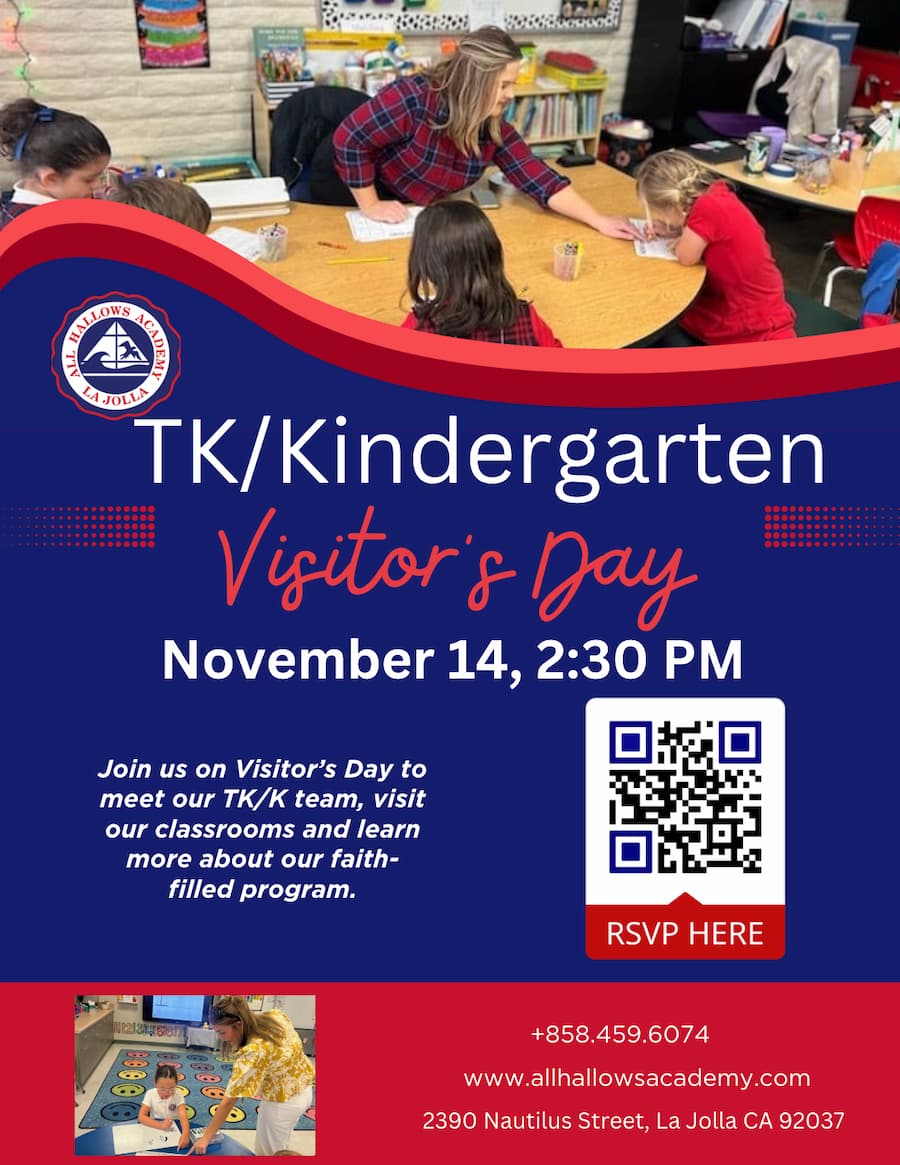 Join us at All Hallows Academy in La Jolla for an unforgettable TK/Kindergarten Visitor’s Day on November 14 at 2:30 PM! Discover a faith-filled educational experience where students thrive from TK-8, supported by our dedicated TK/K team, vibrant classrooms, and a rich program. Explore our state-of-the-art facilities, including a library, sports field, art studio, garden, music room, and technology lab. Located at 2390 Nautilus Street, La Jolla, CA 92037, we invite you to RSVP at www.allhallowsacademy.com or call +858.459.6074 to learn more about where faith and education meet!